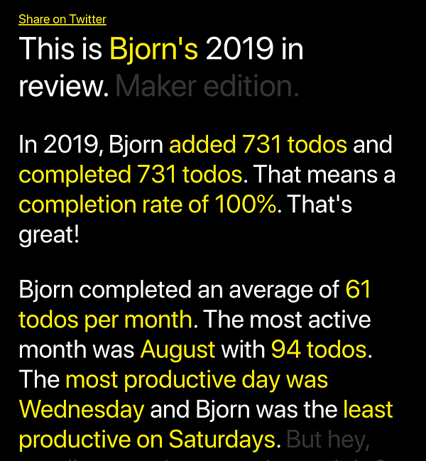 Weekly/monthy overview that I can share on my socials. Like the WIP Year in Review you already made.