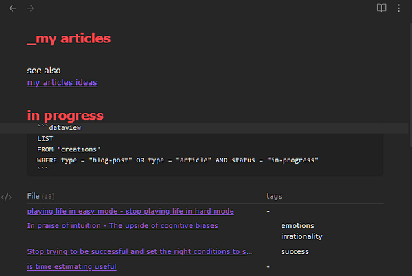 Implement dataview in my Obsidian vault to see a list of articles in progress