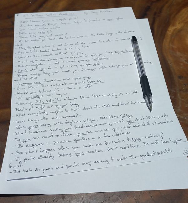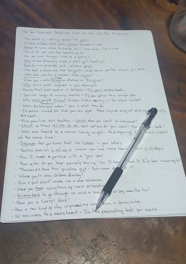 Copywork: 45 minutes hand writing The 100 Greatest Headlines Ever Written by Jay Abraham