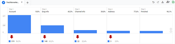 #dogfluence Dogfluencer sign-up form. Conversion percentage = 3,95%. Drop-off first step 60%. Changed text on first page to verbs. Let's see.