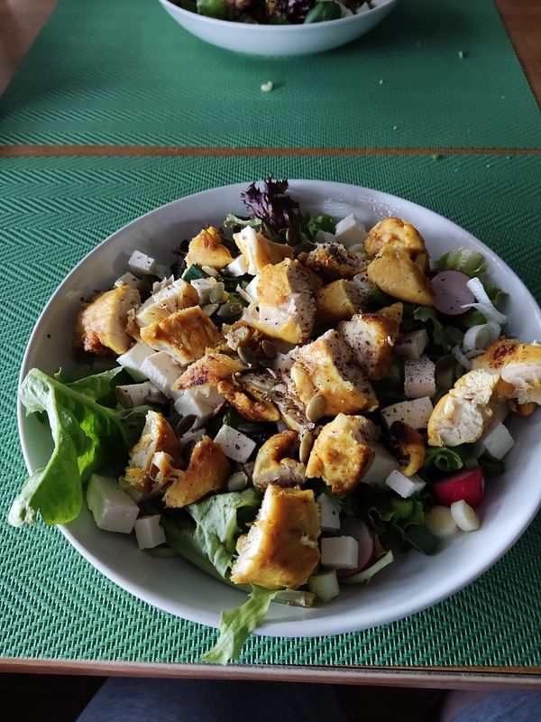 A perfect cutting meal, 200 grams of chicken breasts, veggies, onions, cheese, radish, olive oil