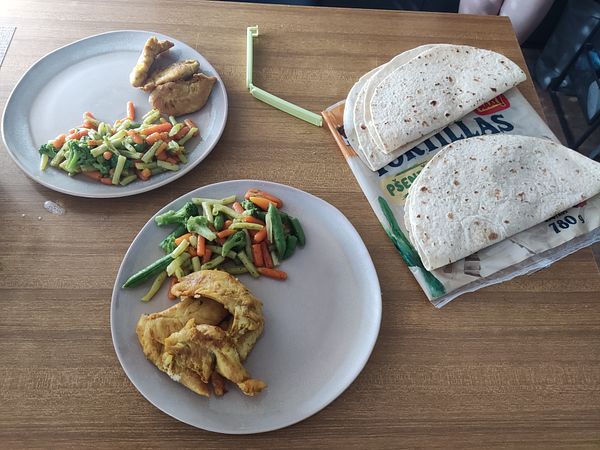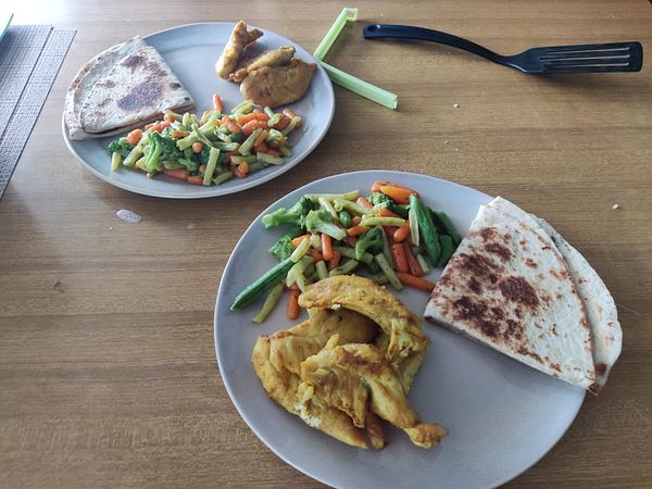 Making a healthy lunch, proteins and veggies. Premade chicken breasts with frozen veggies that you just need to boil in a pan for a while