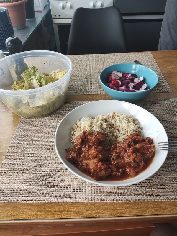 Meat and rice, I'm lucky cause my wife cooks awesome food