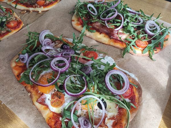 Healthy pizza with eggs, bacon and tuna