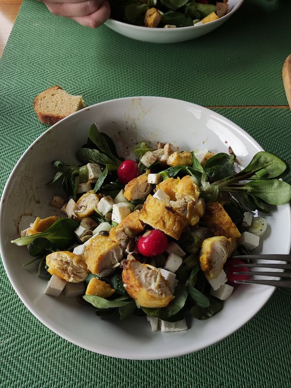 A perfect cutting meal, 200 grams of chicken breasts, veggies, onions, cheese, radish, olive oil