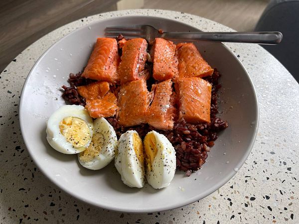 Salmon, eggs, red rice #foodlog
