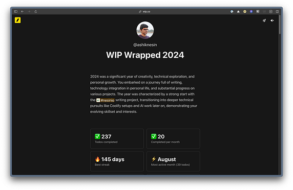 , for the WIP wrapped. It gave a really good summary of what I've done in the months in which I was active.