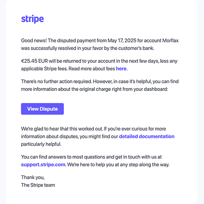- Got a nice business win: you won a payment dispute for the first time in