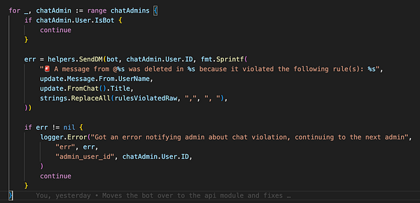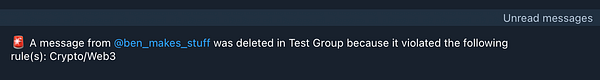 @jasonleowsg let me know that the alert messages that Watchdog sent inside the group chat were too much, so I switched Watchdog to send alerts in a private DM to admins instead