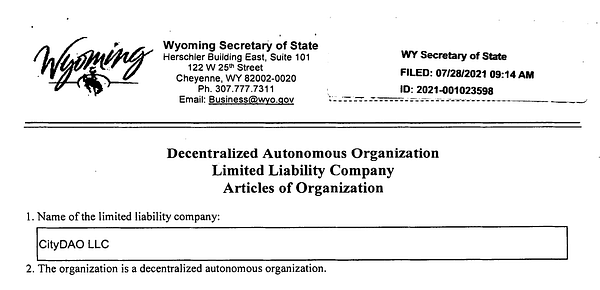 Confirmation that CityDAO has been successfully registered as an LLC in the state of Wyoming πŸ’₯