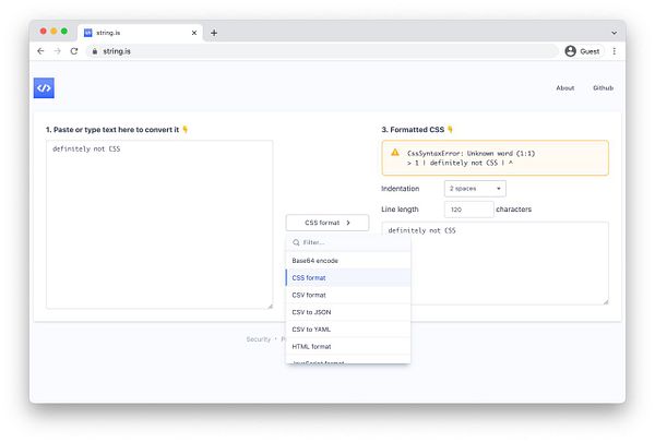 Add a CSS formatter, and a mechanism for displaying errors #stringis