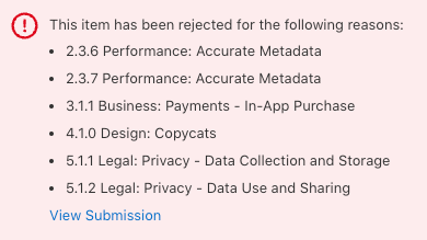 Rejected on App Store, approved on Google Play. I'll just add IAP and they'll probably let me in, Apple likes moneys.