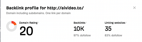 Increased DA from 0 to 20 for aivideo.to in over just 2 months.