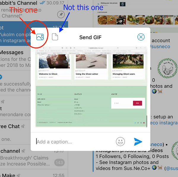I sent an animated gif from Telegram web client and worked one time, but not always the case.Make the gif dimension as small as possible