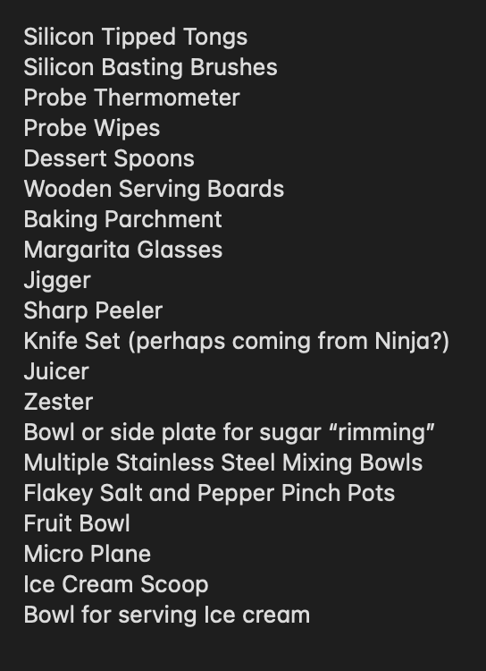 Send equipment list for chef demo
