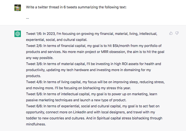 ChatGPT experiment at summarizing long form posts into Twitter threads, inspired by @swizec - it works somewhat! Just prompting it to summarize gave very formal prose. Got stopped when I added "in the voice of <celebrity/famous person>". Had to add "in the voice that's informal, conversational and punchy" to make it better, after 3 tries. Maybe good as a first draft for me to work on? 🤔