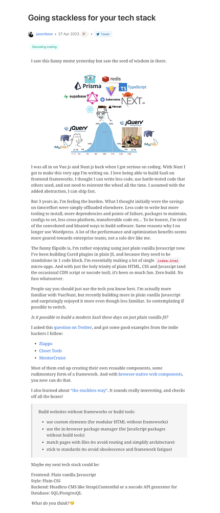 Day 847 - Going stackless for your tech stack - golifelog.com/posts/going-sta… #lifelog