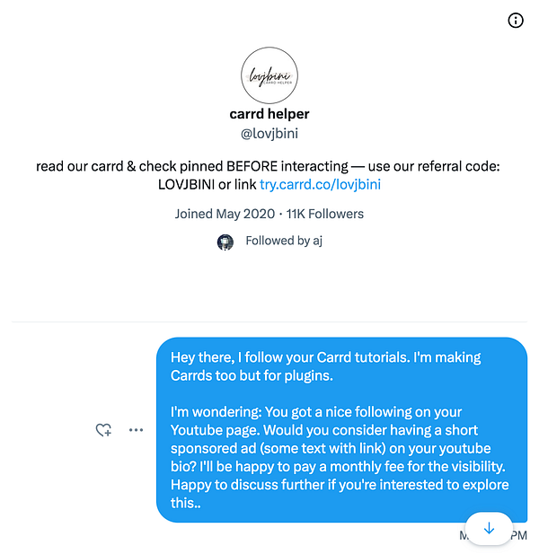DMed Carrd influencer @lovjbini on Twitter (11k following on Twitter, 20.7k Youtube subscribers) to ask if they're keen to be sponsored, and they said YES 🤩 Now discussing the sponsorship details