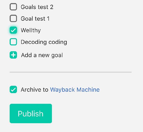 π Side project weekend: Added a way to remember checkbox preference of Wayback checkbox. Added Bulma checkbox library from Justboil.me to /write page goals checkboxes.