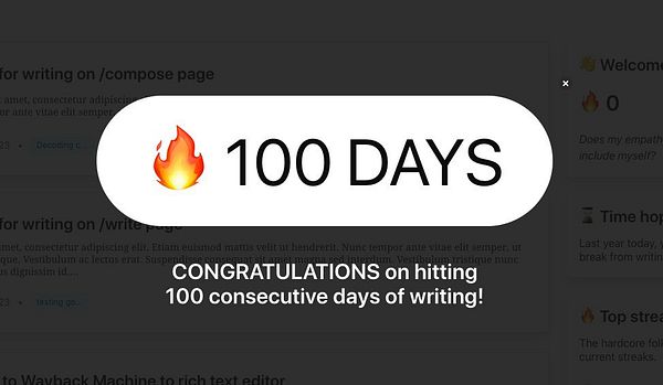 π Side project weekend: Added more celebration modals for various streak milestones - 365, 100, 30, 7 days. Visual design needs more work but good first step to celebrating writer's efforts!