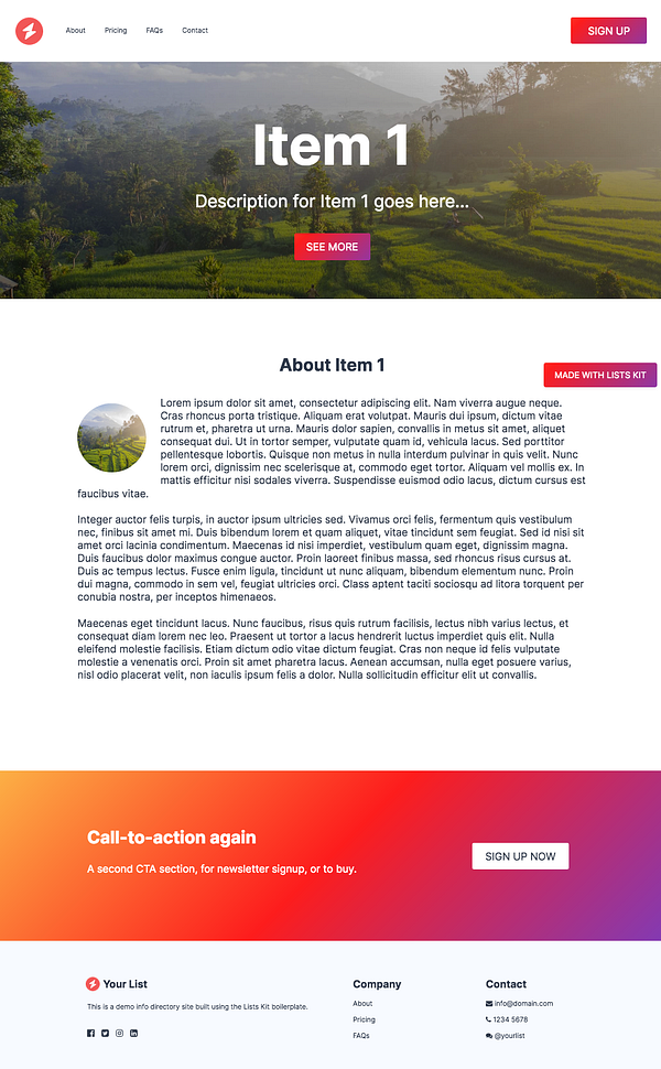 Improved on item page template, tweaked meta tags of saas starter #listskit