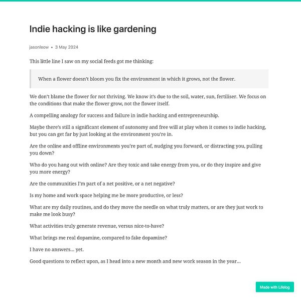 Day 1219 - Indie hacking is like gardening - golifelog.com/posts/indie-hac… #lifelog