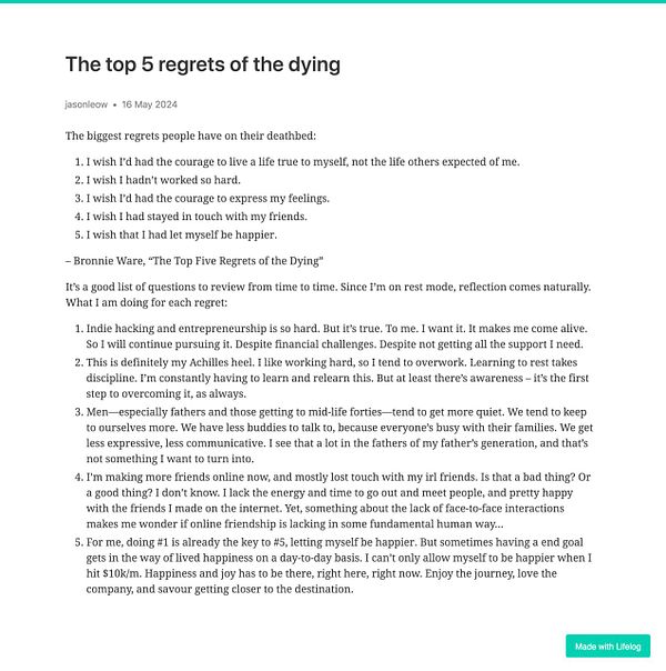 Day 1232 - The top 5 regrets of the dying - golifelog.com/posts/the-top-5… #lifelog
