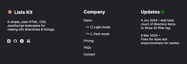 Updated Company and Updates sections of main landing page footer #listskit