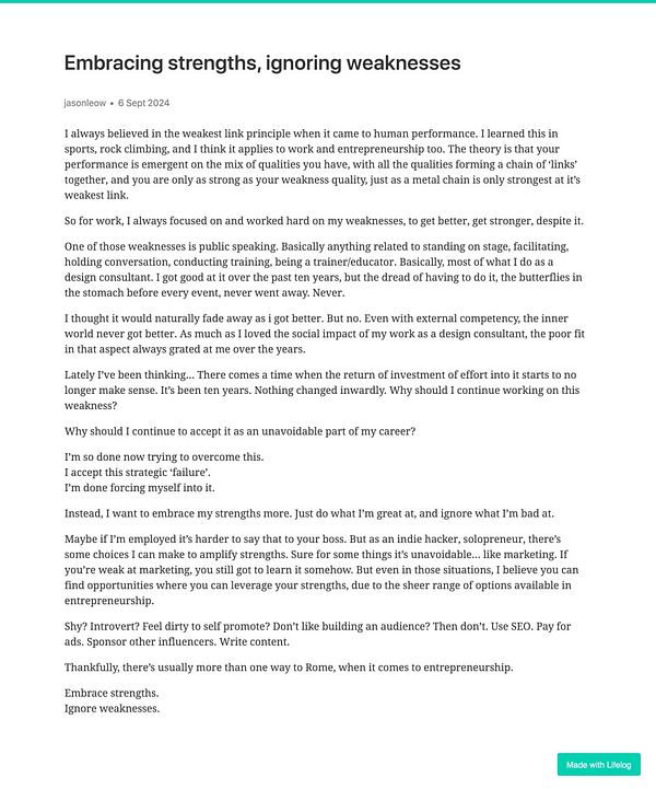 Day 1345 - Embracing strengths, ignoring weaknesses - golifelog.com/posts/embracing… #lifelog