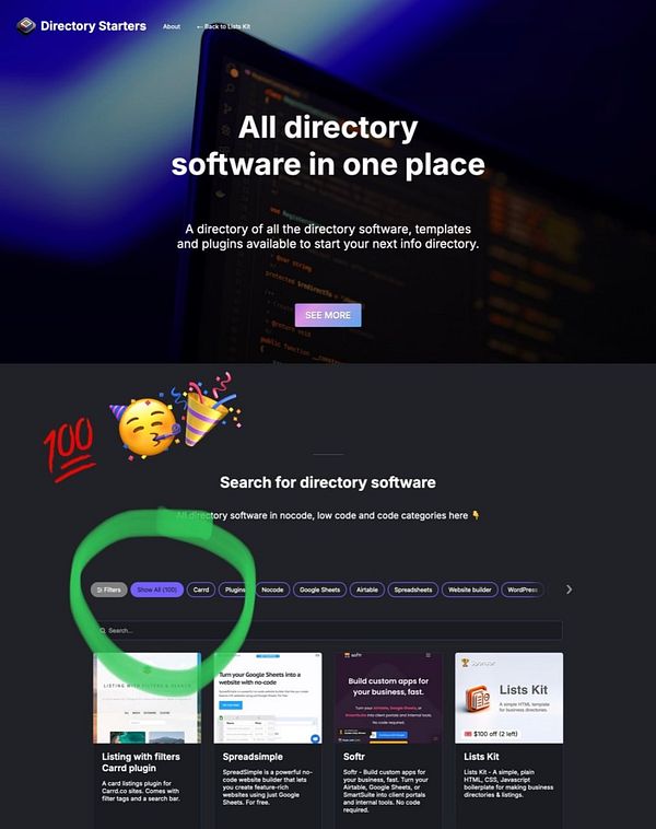 πŸ₯³ πŸŽ‰ YES, hit 100 listings! For my Directory Starters directory (listskit.com/directorystarters). I can finally stop now... #listskit