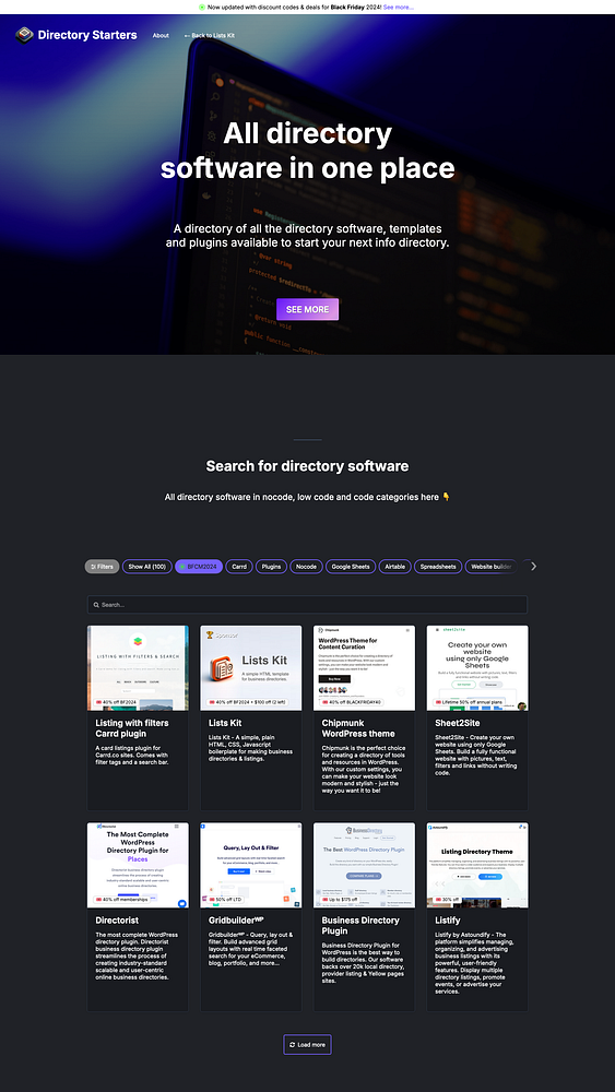 Added BFCM2024 details, BF top banner, filter tags and url params filtering. Fixed horiz filter scrolling blur elements on left and right. Added function to add active class to BFCM2024 tag if filter url exists to the Directory Starters directory - listskit.com/directorystarter… #listskit