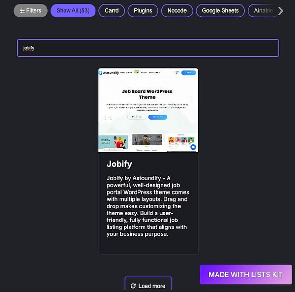 Added 1 new item Jobify (astoundify.com/products/jobify), a WordPress directory theme by Astoundify, to the Directory Starters directory (listskit.com/directorystarters) #listskit