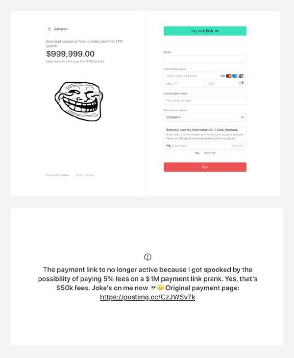 Made a $999,999 stripe payment link as a tweet prank for fun but later realised if someone paid and dispute immediately, I would get a $50k stripe fee bill. Immediately went to deactivate payment link... joke's on me now 💀 🙃 #indiejourney