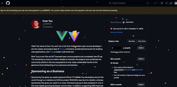 Bought Evan You/Vue.js a $5 coffee on Github to thank him for making Vue which helped me build indie products #indiejourney