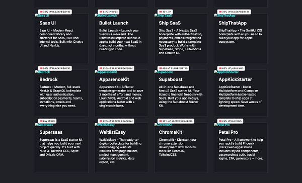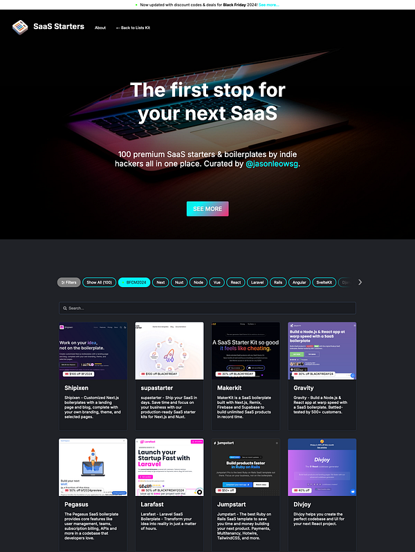 Added BFCM deals/discount codes of boilerplates to SaaS Starters directory. Also added BFCM top banner, and URL params that filters the listings on page load - listskit.com/saasstarters/?fi… #listskit