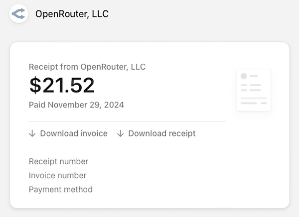 Signed up for OpenRouter to try out more LLM APIs, bought US$21.52 credits #indiejourney
