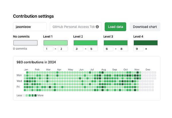 Made personal Github chart tool to generate my own commit charts with my own level settings, because I hate that a single high contribution day skews the shading algo and everything becomes pale green.. and loses info density - jasonleow.com/github-contribu… #githubchartremixer #commit365