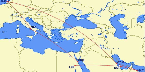 explore possibilities to travel to πŸ‡ͺπŸ‡¬ Egypt and πŸ‡΄πŸ‡² Oman in june, e.g. AMS-NAP-HRG,LXR-DOH-MCT-DMM-AMS #travel