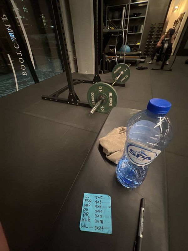 5x5x40kg deadlift+++++ 4x6x40kg front squat++ 4x8x40kg ohp+ 3x10x pull up wide grip= 3x10x hanging leg raise= 3x12x40kg pendlay row+ 3x24x30kg walking lunges+
