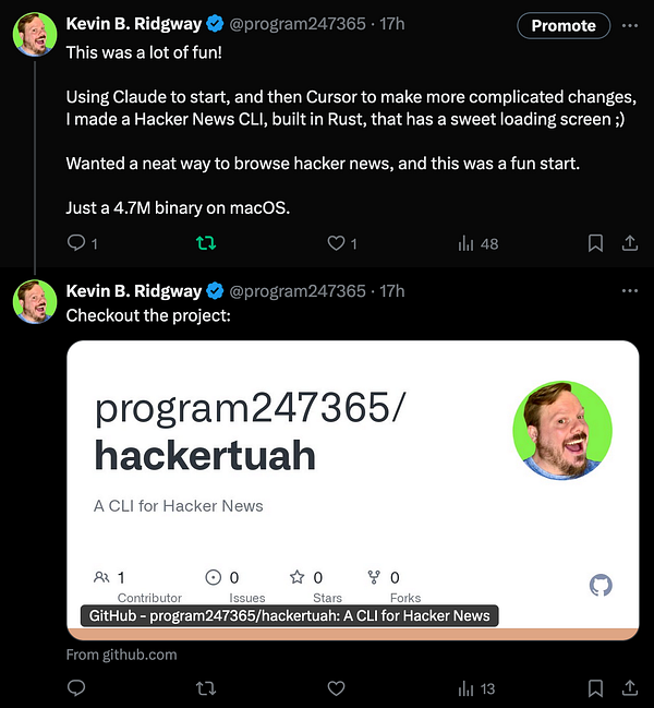 With the help of Claude, and Cursor, shipped a Hacker News CLI. Was a lot of fun! Got the initial version running in 20 minutes with some prompts from Claude.