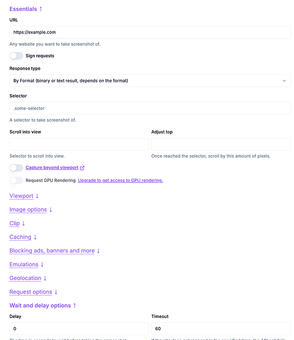 #screenshotone playground with all available options from the documentation.