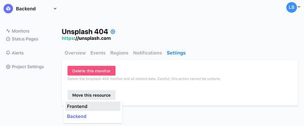 move the monitor deletion from Notifications to Settings and add a button to move the monitor to another project #hyperping