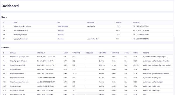 dashboard tables for users, domains & events #hyperping