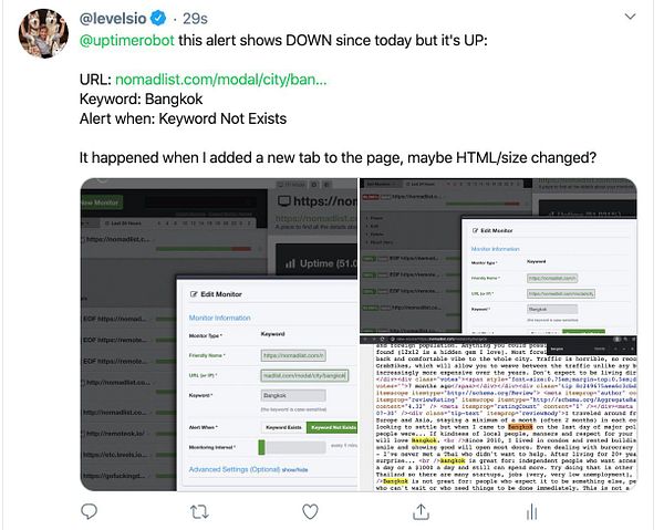report to Uptimerobot there's a bug showing page as DOWN that's UP #nomads twitter.com/levelsio/status/1…