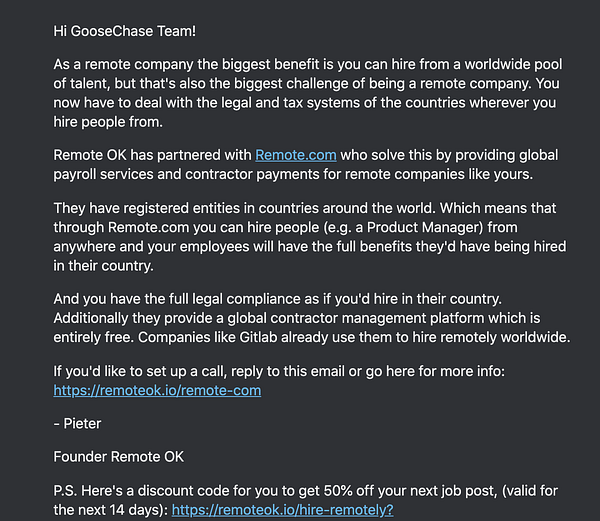 make send partnership email 2 days after job post robot for Remote.com partnership #remoteok