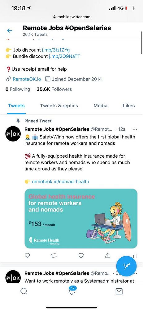 add new Safetywing sponsored pinned tweet with tracking link #remoteok