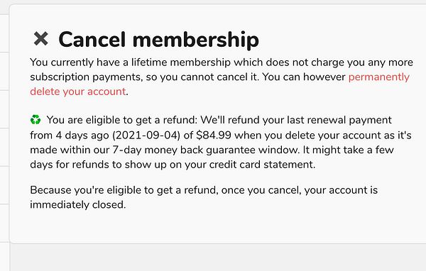 change text if user does not have an active subscription (e.g. lifetime account) tell them if they delete their account we also refund