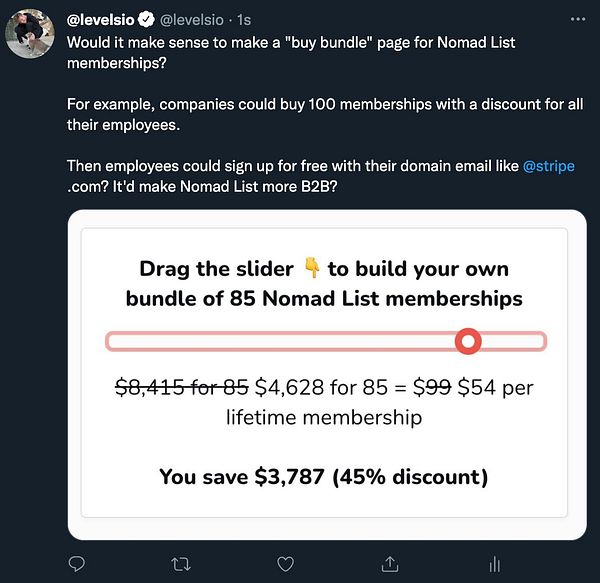 ask Twitter if I should sell #nomads membership volume bundles to companies make it B2B twitter.com/levelsio/status/1…