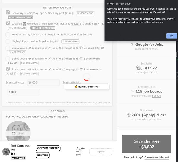 test and pass redirect if no payment method on job post edit after posting with a bundle code generated by admin #remoteok