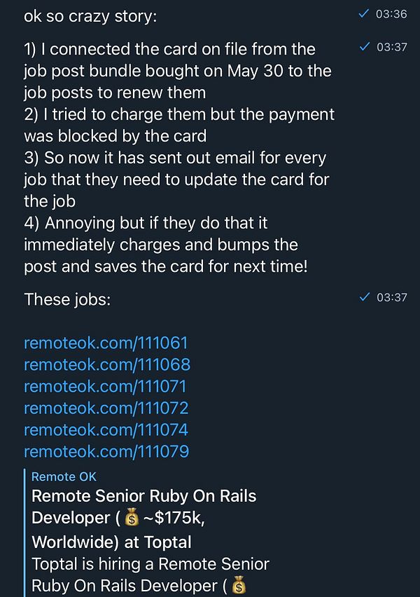 tie card from job post bundle payment of May to the job posts to renew them and try to renew them but the card declines payment so now it has emailed Toptal to update the card for each job after which it will auto bump them